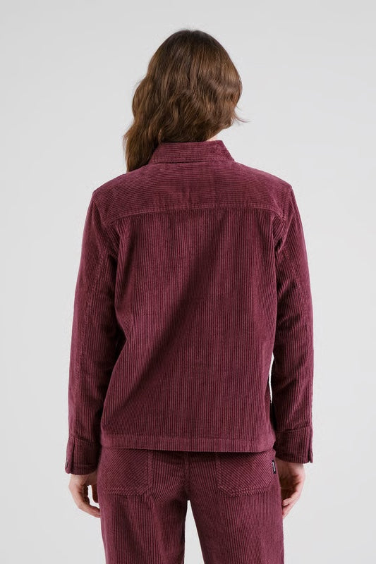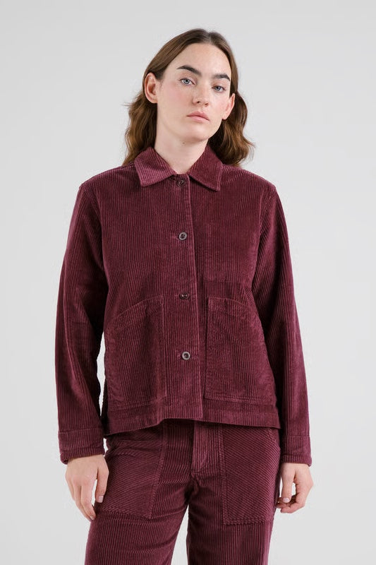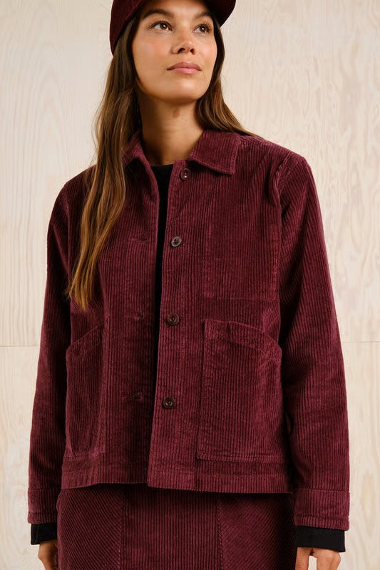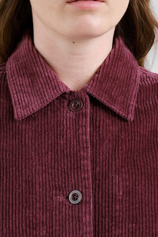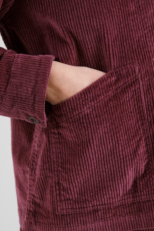 Long-sleeved shirt jacket with a relaxed fit. Angled front patched pockets and inside chest pocket with visible stitching on the outside. Button up closing and button on cuffs. Made in organic cotton corduroy.