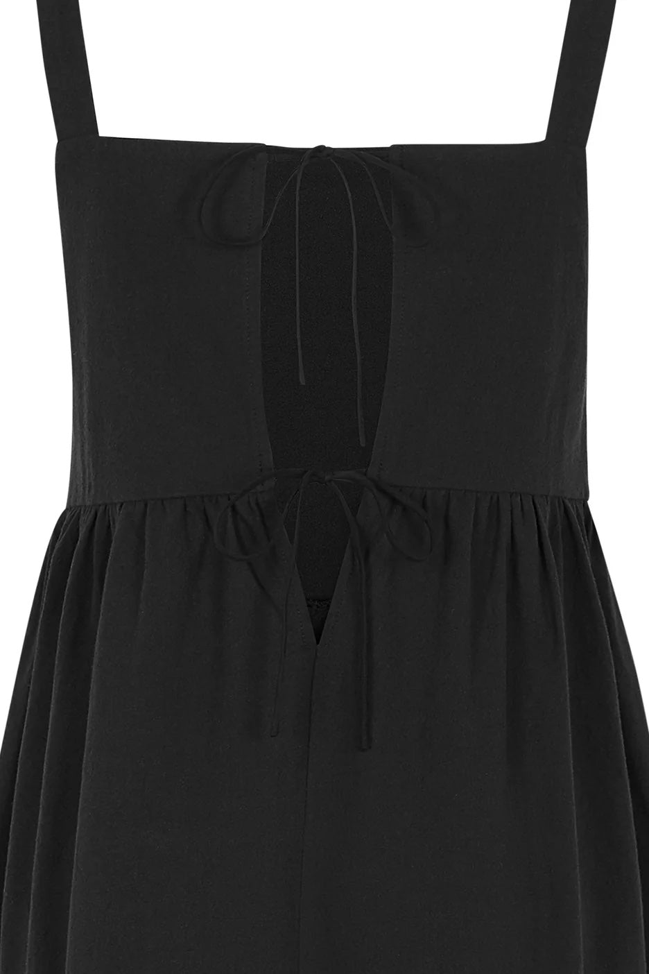 Introducing the Mio Dress in black, made from luxurious 100% organic cotton. This dress features delicate straps and a waist cutline for a flattering fit, while the front pockets with raw edge details add a touch of sophistication. The gathering at the waist and slit with tie strings at the back give a stylish, feminine touch. Elevate your wardrobe with this elegant and sustainable piece.