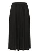 This black midi skirt features a slightly flared silhouette with a smooth finish and an elasticized waistband. The skirt extends to mid-calf length, offering a simple and streamlined look without visible embellishments or patterns.