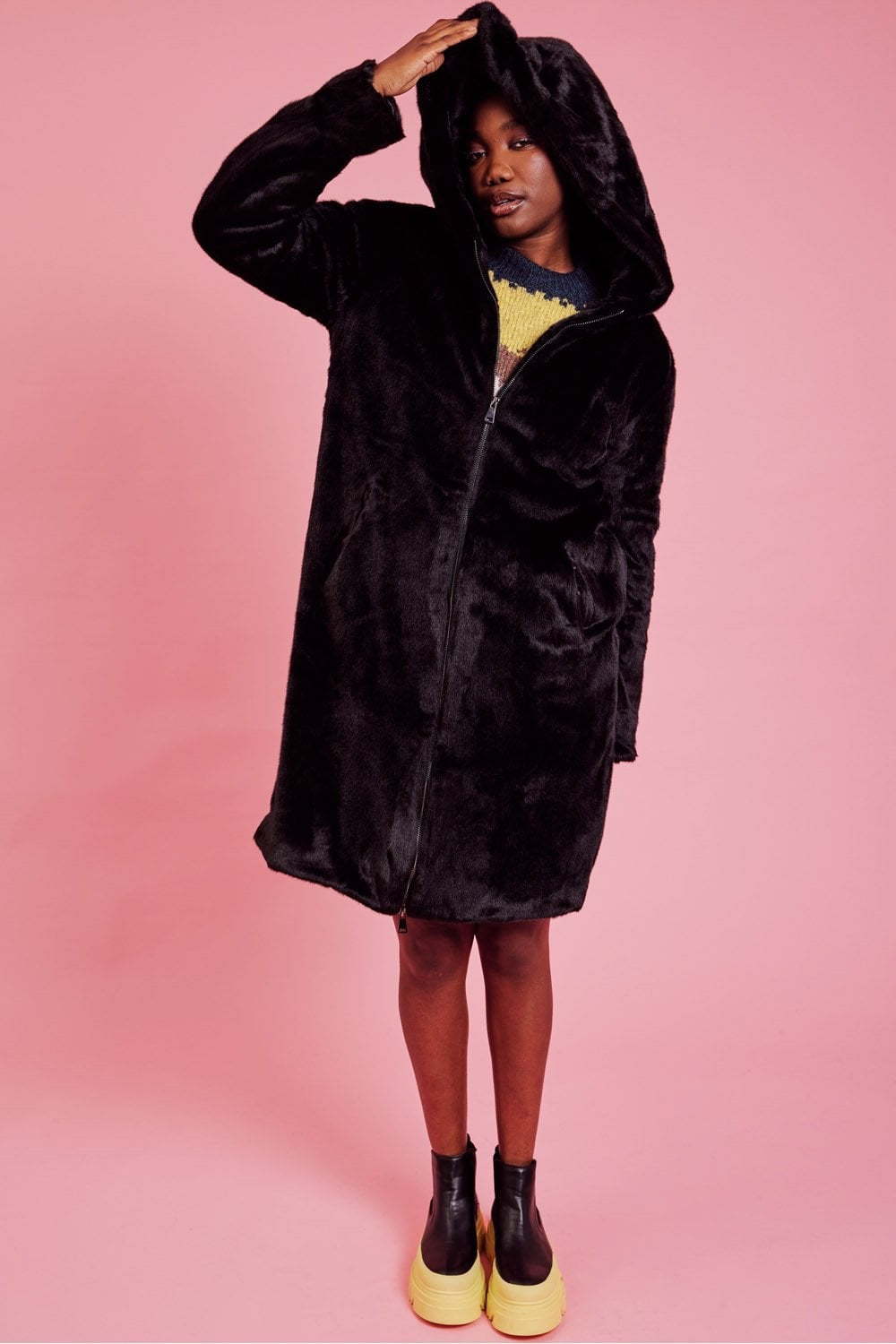 Wrap yourself in playful luxury with this Black Oversized Faux Fur Jacket. Featuring an oversized hood for extra snug vibes and handy side pockets to keep your hands warm or stash your essentials. The zipped fastening offers easy wear while the midi length adds a chic touch. Made from a soft, durable blend of 15% acrylic and 85% modacrylic, it fits comfortably from UK 8-14 (US 4-10). Perfect for standing out in cozy style wherever you go!