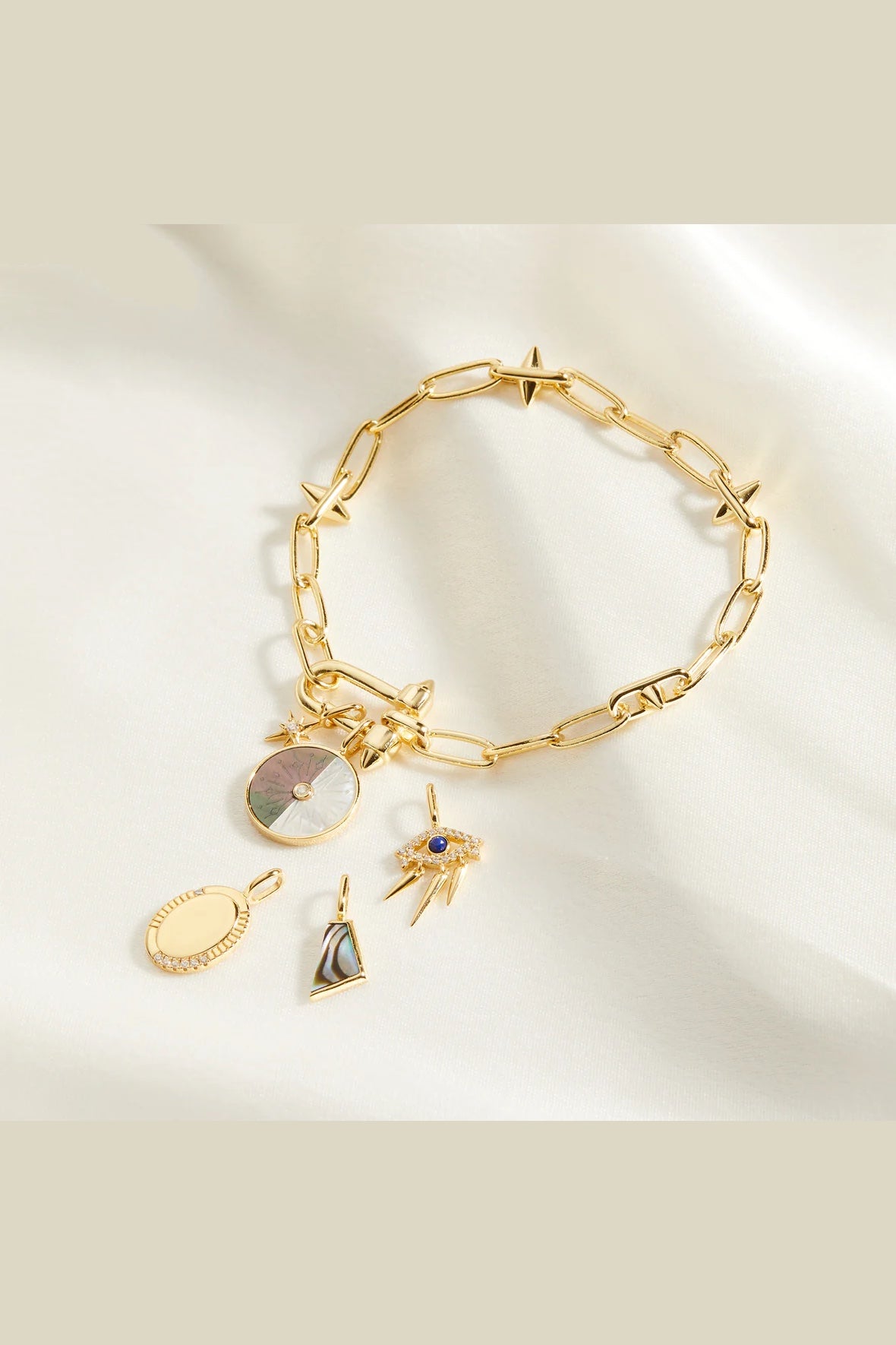 The perfect balance of iridescence and sparkle, this elegant charm adds something special to our necklace and bracelet chains. Set on 14kt gold plated 925 sterling silver, a rounded kyoto opal gemstone is paired with a row of sparkling cubic zirconia stones to create a unique droplet charm. Simply slip onto a chain necklace or bracelet from our Pop Charms collection for a sophisticated look.