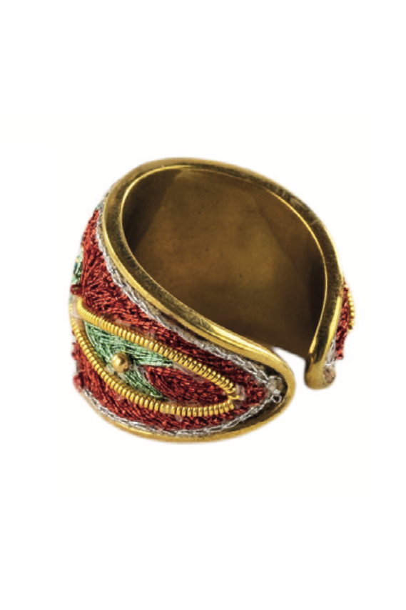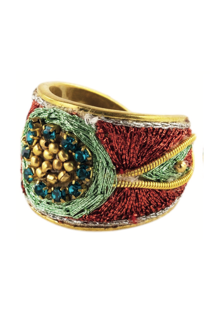 Indulge in the exquisite Apa Metallic Ring from Firebloom. Crafted with luxurious brass and adorned with hand-embroidered applique of metallic thread, brass beads, and rhinestones. Its adjustable design ensures a perfect fit. The anti-allergenic and stainless steel brass hooks make it safe for sensitive skin.