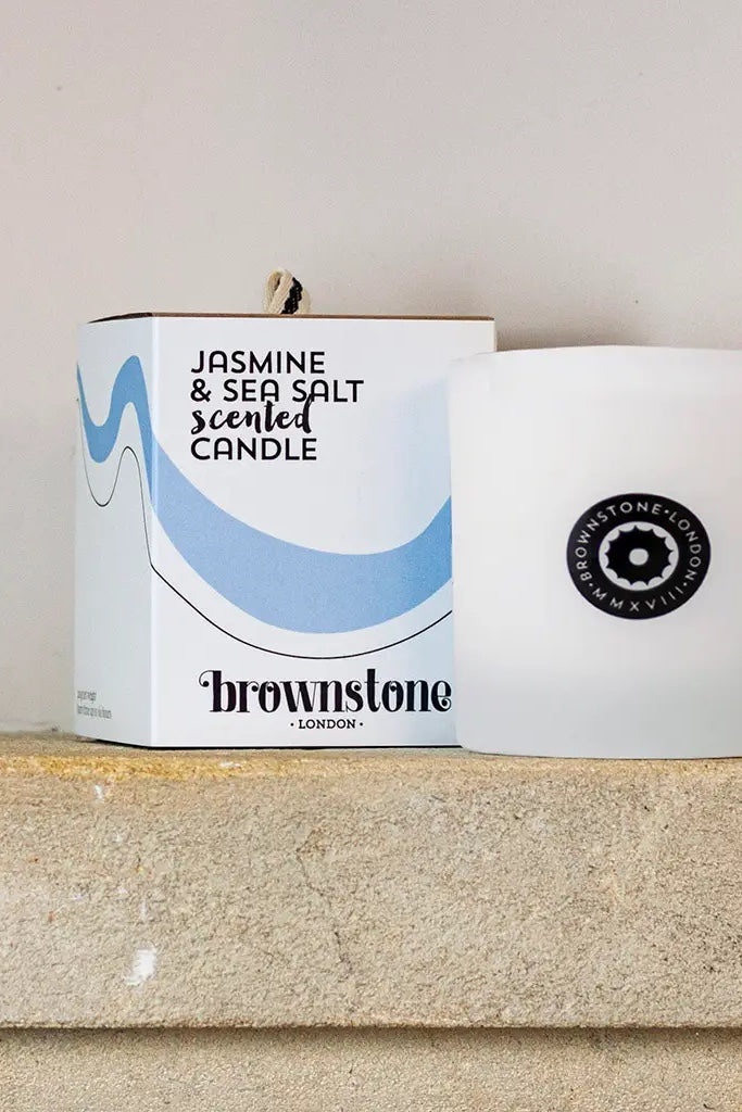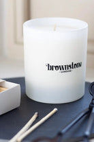 Now available with our new semi-opaque matte-finish glass, a fabulous icy-white effect with our long brownstone logo and circular icon printed in black gloss front and back, a lovely update for our classic white candle