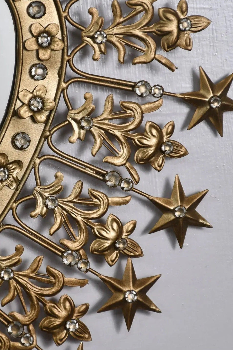 Handcrafted from metal with an antiqued gold finish, this bejeweled mirror captures and reflects light with a soft, radiant glow. Surrounded by rings of stars, it makes a celestial statement—adding a sense of wonder and vintage elegance to any room.