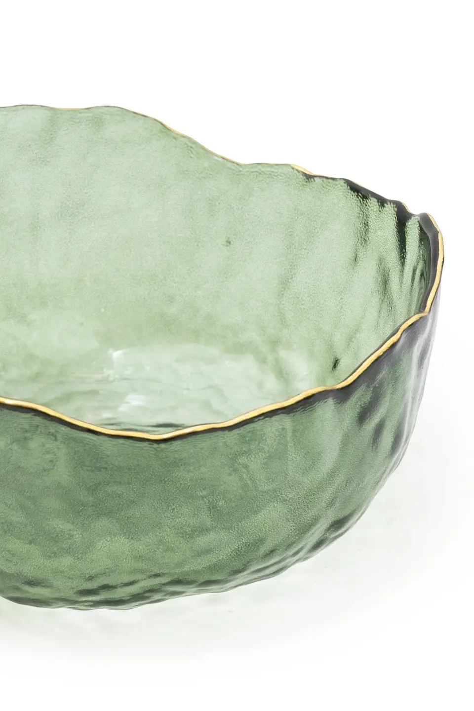 Add a touch of modern elegance to your home with our Large Green Glass Wavy Bowl. The unique shape and gold rim make it perfect for serving and decorating. Versatile and sophisticated, it's sure to stand out in any space.