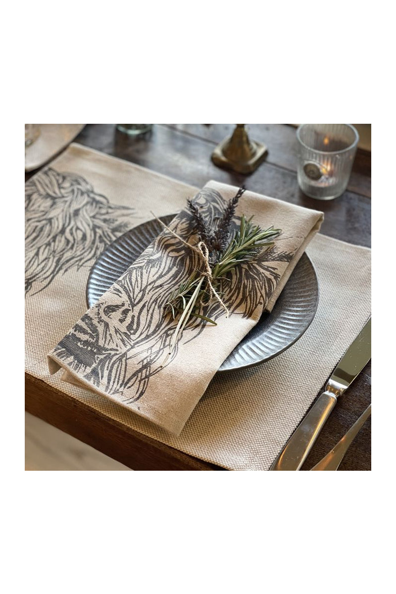 4 unique linen/cotton blend napkins, each screen printed with a unique highland cow design. These distinctive napkins will adorn your table. The natural finish of these napkins offer a minimalist look that will add a simple sophistication to your table. The perfect go-to pieces for dinner or drinks.