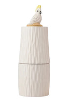 A playful Swedish-designed salt & pepper mill adds a personal touch to your kitchen or dining table. A carved white cockatoo in wood adorns the top of the white mill. The handcrafted chip-carving on the mill body enhances the natural feel of the wood.