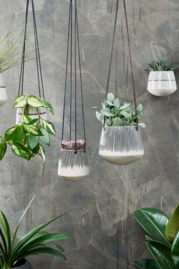 These Matamba ceramic planters are embellished with a stylish black etching detail that contrasts against an off-white glaze. The planters have a flat reverse, designed to fit neatly on a wall, allowing you to create an interesting display of plants.