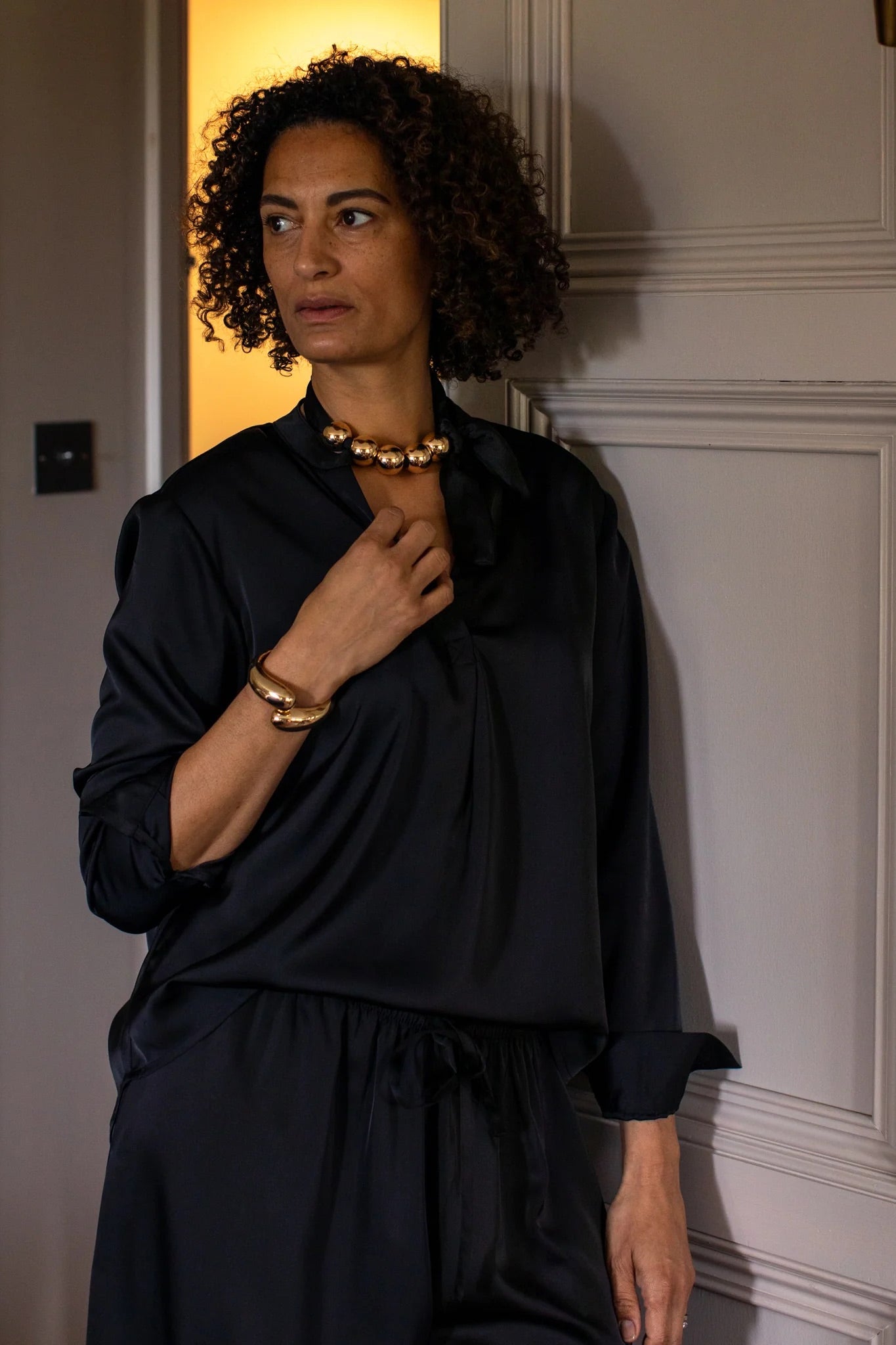 Josie is a sleek satin shirt with a subtle V-neck and long sleeves. Its neat, tailored shape adds effortless elegance—perfect for layering or wearing on its own for a polished look.