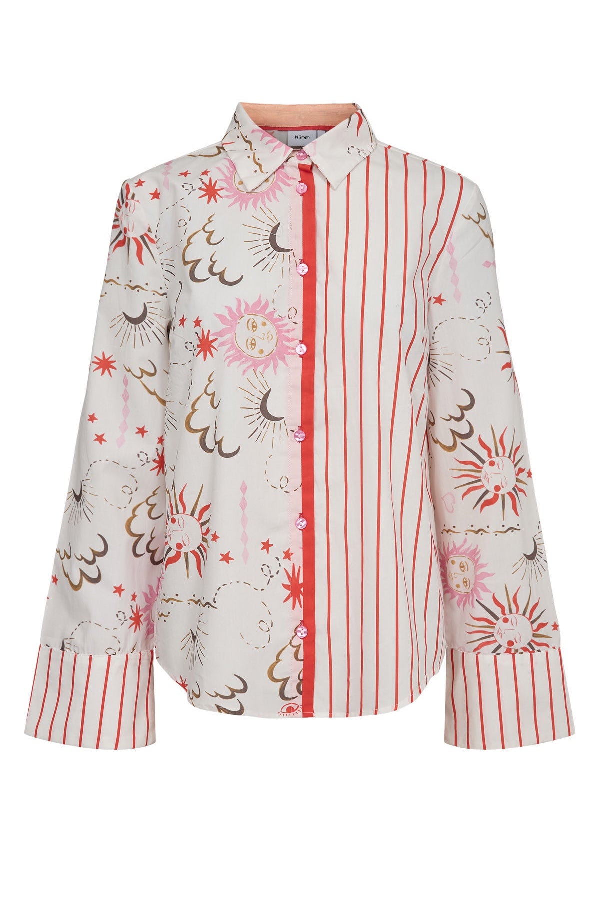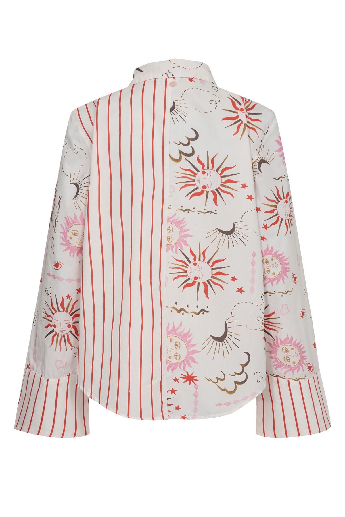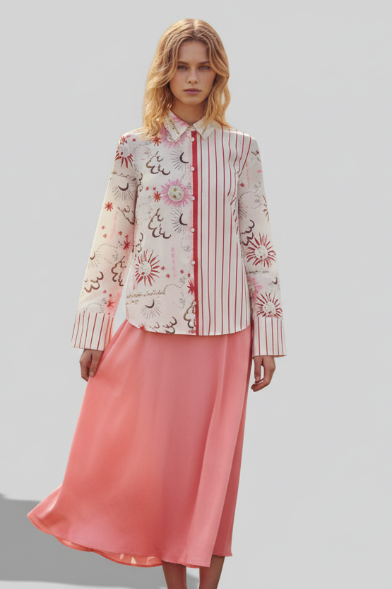 This elegant Soleima Mix Shirt features a unique design combining half striped patterns with delicate, simplistic illustrations of the sun, moon, and clouds. Crafted for those who appreciate subtle artistry and refined style, it offers a sophisticated look that effortlessly blends classic and contemporary elements. Perfect for adding a touch of understated charm to your wardrobe.