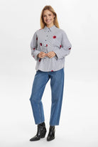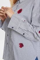 Crafted from a refined blend of 95% cotton and 5% elastane, the Tillie Shirt in Dark Sapphire offers both comfort and subtle stretch. Its elegant white fabric features a delicate navy pinstripe pattern, accented by charming red floral details and distinctive flower-shaped buttons, creating a sophisticated look perfect for elevating your wardrobe.