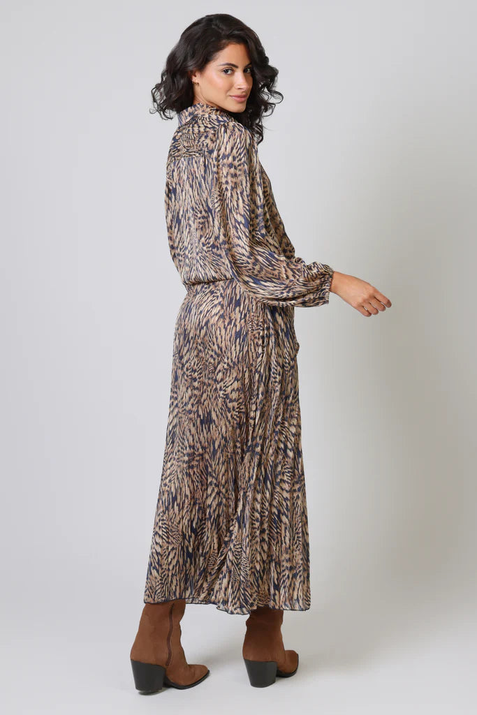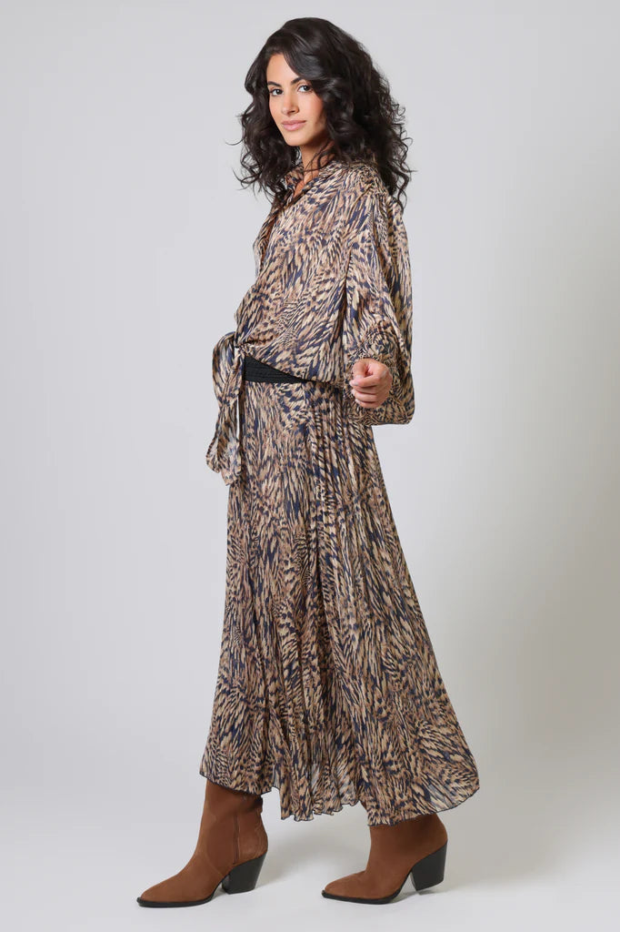 The Tremors Shirt has a classic women's button down shirt fit, but with a flattering front tie detail to make it all the more casual and comfortable. The blouse has long balloon sleeves with elasticated cuffs to create a relaxed silhouette. In this unique navy blue and brown animal style print, which has subtle threads of silver peeking through. Why not pair with our matching Hera Skirt for the full summer outfit.