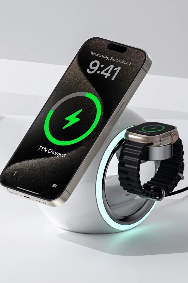 The Capsule 3-in-1 Wireless Charger features a unique sequence of lighting options: warm light, cold light, sleep light, and rainbow light. Simply touch the control ring and hold for 2 seconds to switch on or off, allowing you to customize your ambiance with ease. For the best lighting and charging performance, we recommend using a power supply of 20W or above.