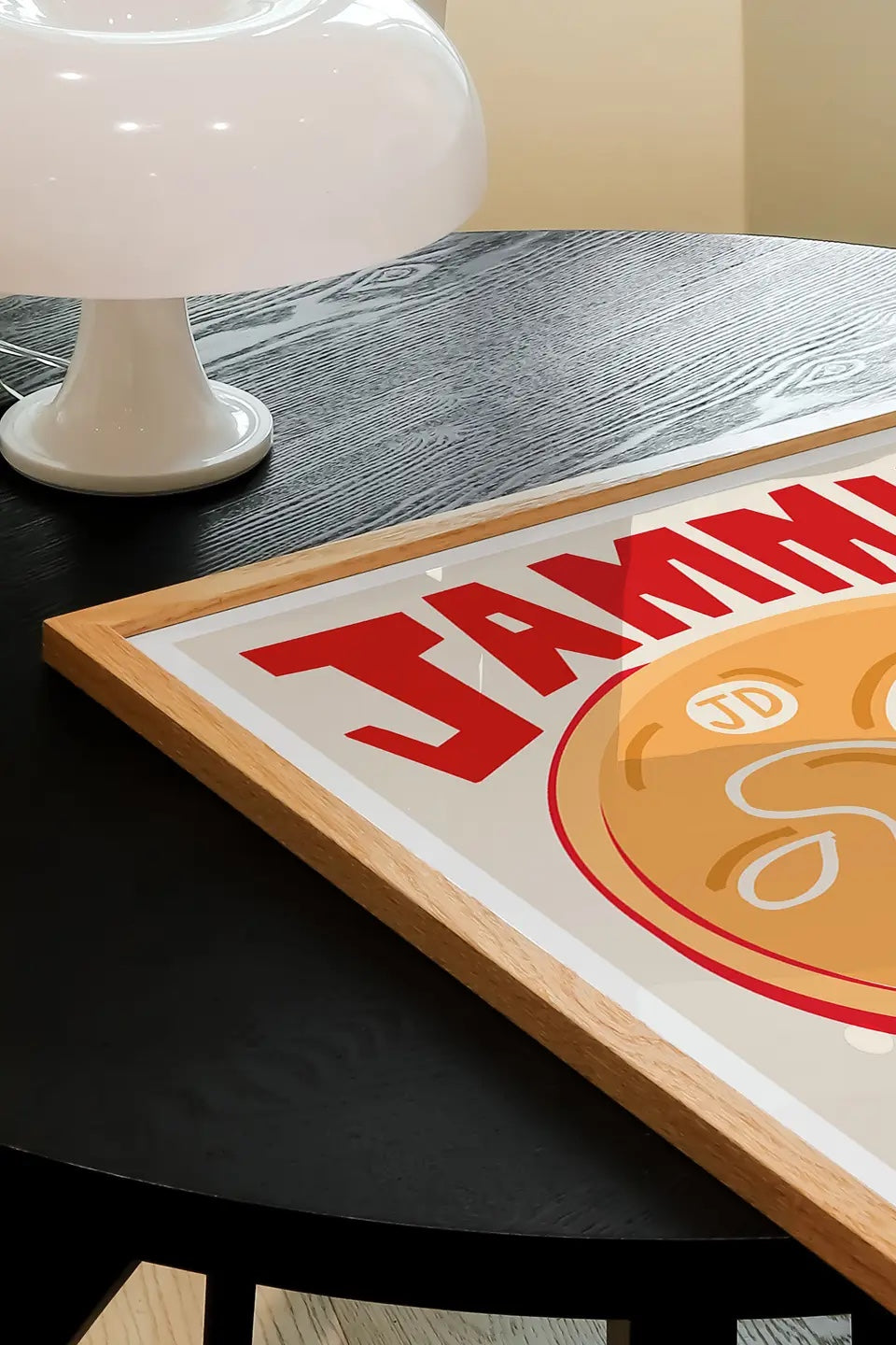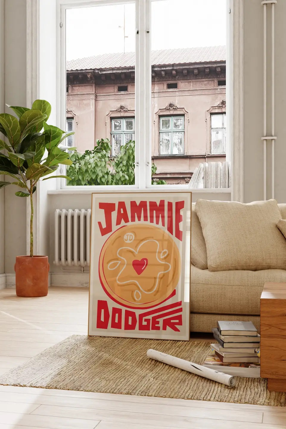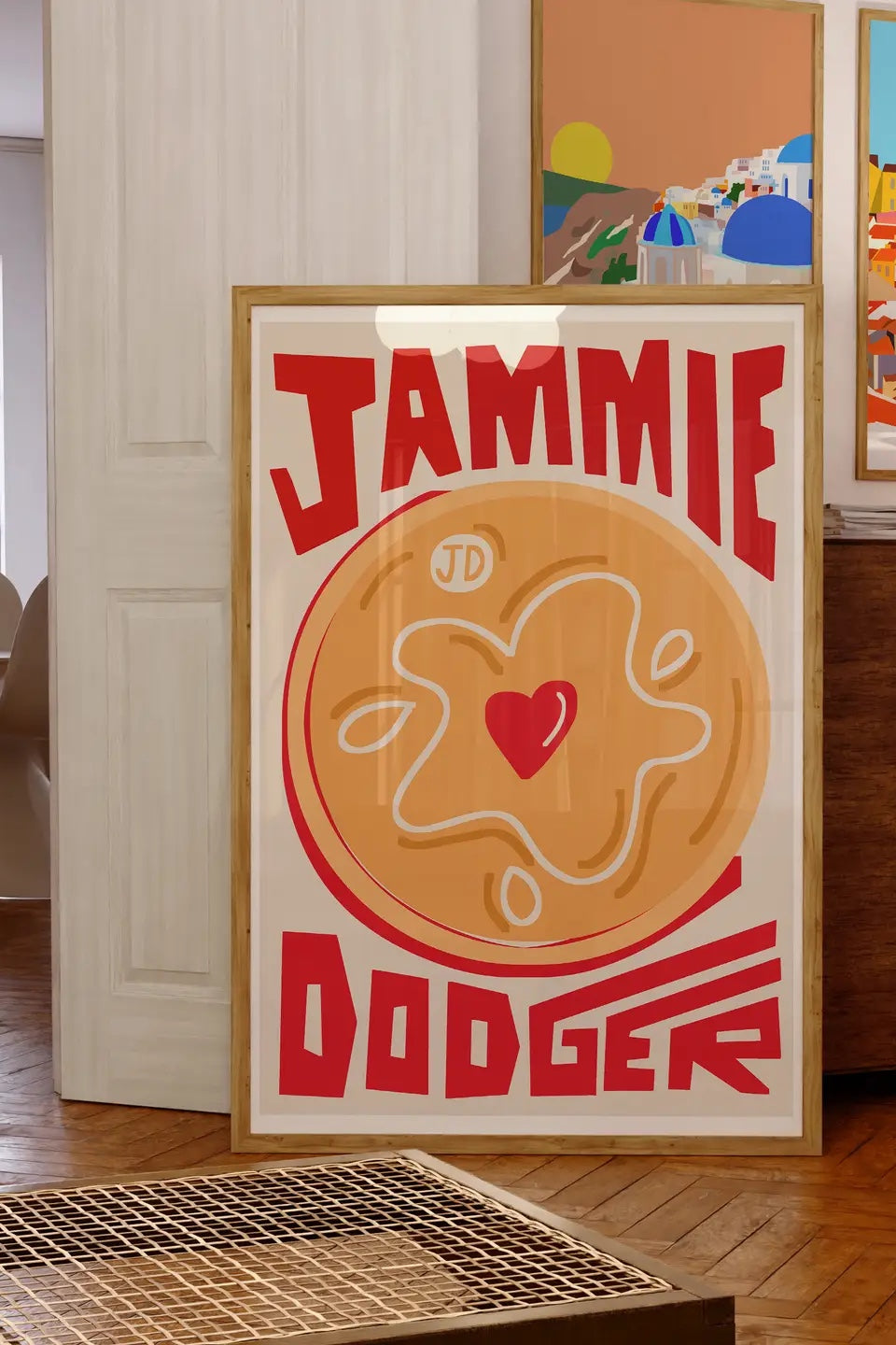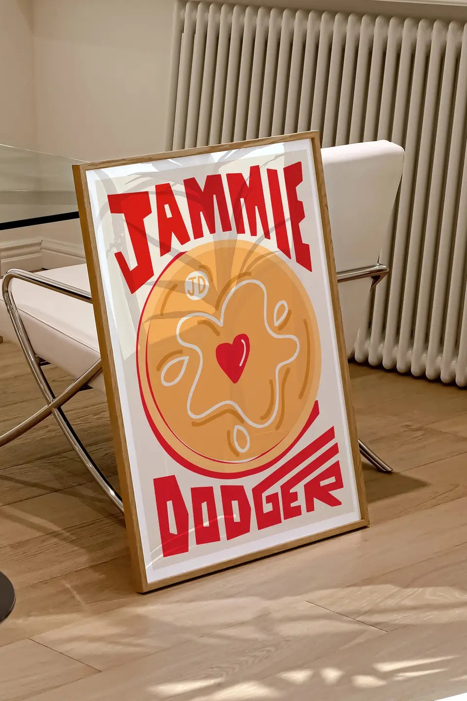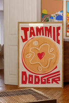 Elevate your kitchen or home decor with our 'Jammie Dodger' framed art print. Bursting with vibrant colors, this retro print adds a fun and unique touch to any space. Professionally printed on high-quality archival card, each detail is brought to life with vivid precision. The perfect gift for a new home or to add a playful touch to any room.