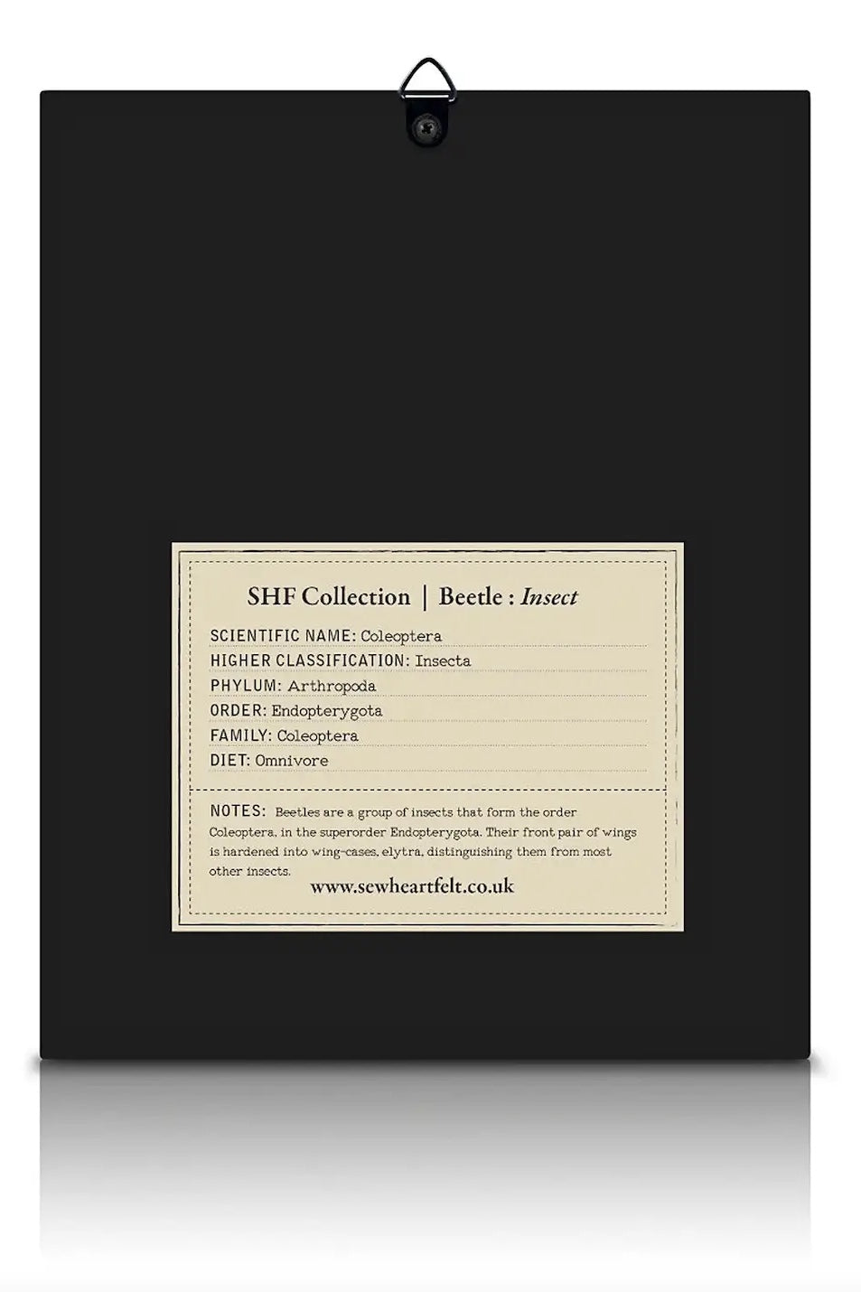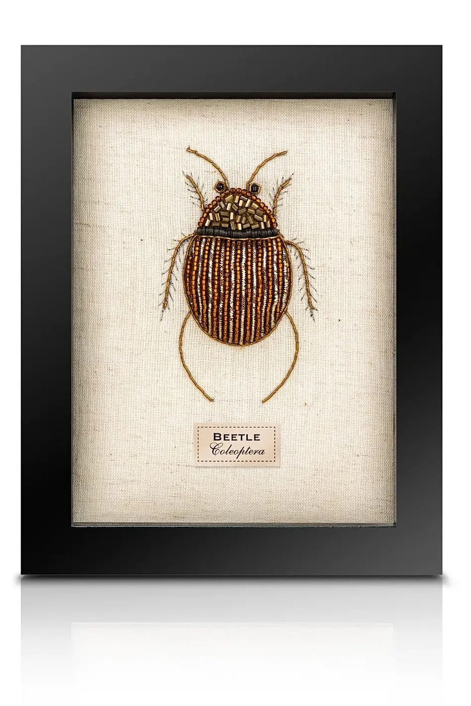 These curious creatures are hand embroidered on organic calico using golden threads and decorated with tiny brass and coloured glass beads. The frame is a hand made wooden box frame finished in matte black.