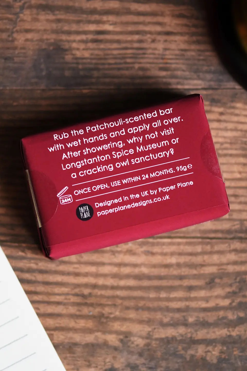 • Made in United Kingdom • Ingredients: Sodium cocoate, Sodium rapeseedate, Aqua, Sodium shea butterate, Pogostemon cablin (patchouli) leaf oil, Pterocarpus soyauxii (sandalwood) wood extract