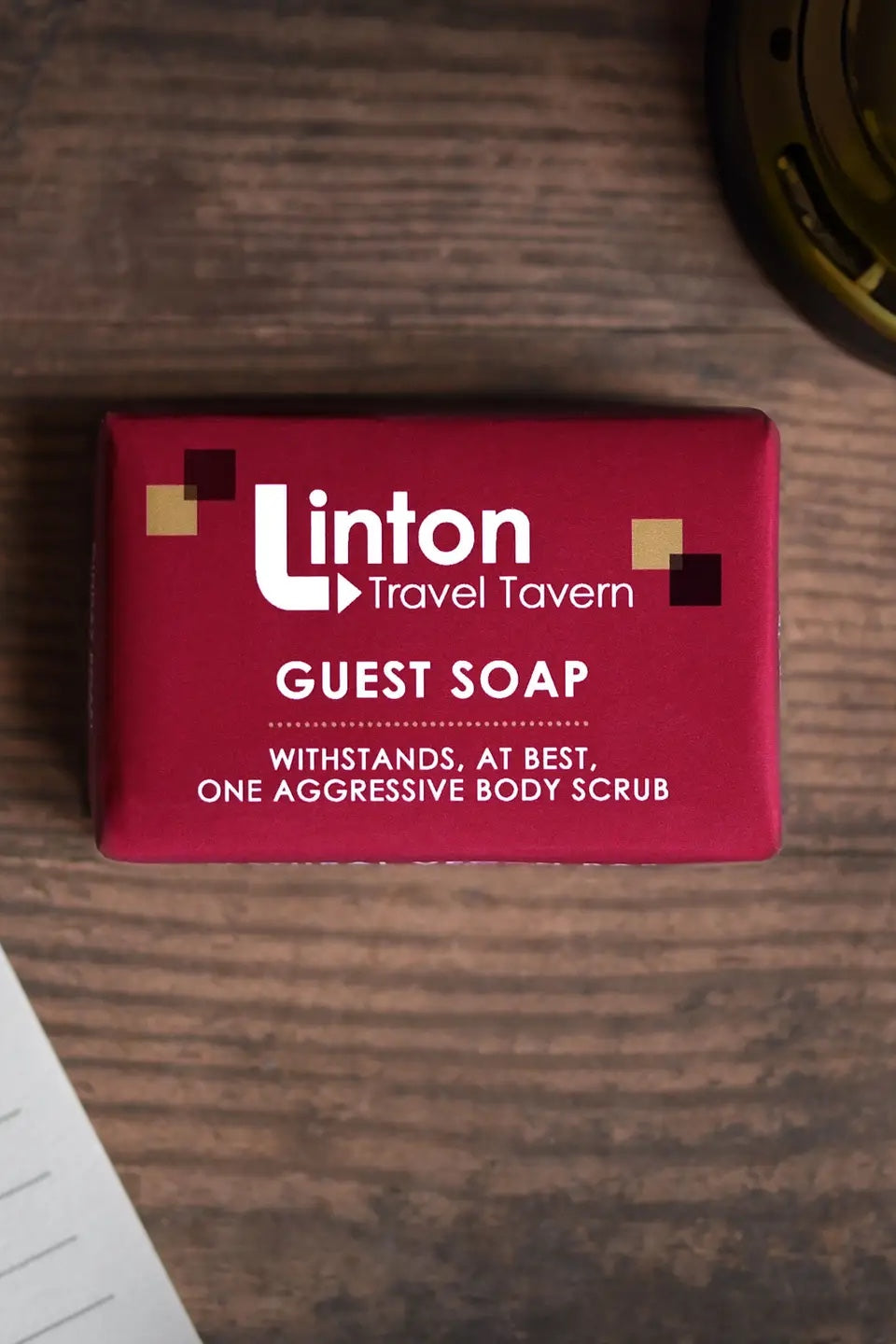 A real soap for a fictional hotel! A bar of Linton Travel Tavern Guest Soap (as imagined by Paper Plane - this is 100% unofficial!). The packaging is packed with references to I'm Alan Partridge, making it a perfect gift for fans of the classic Steve Coogan comedy. The soap itself is top quality, too. Hand-cut and artisan made with natural ingredients and a plant-based recipe, including heady patchouli. Back of the net!