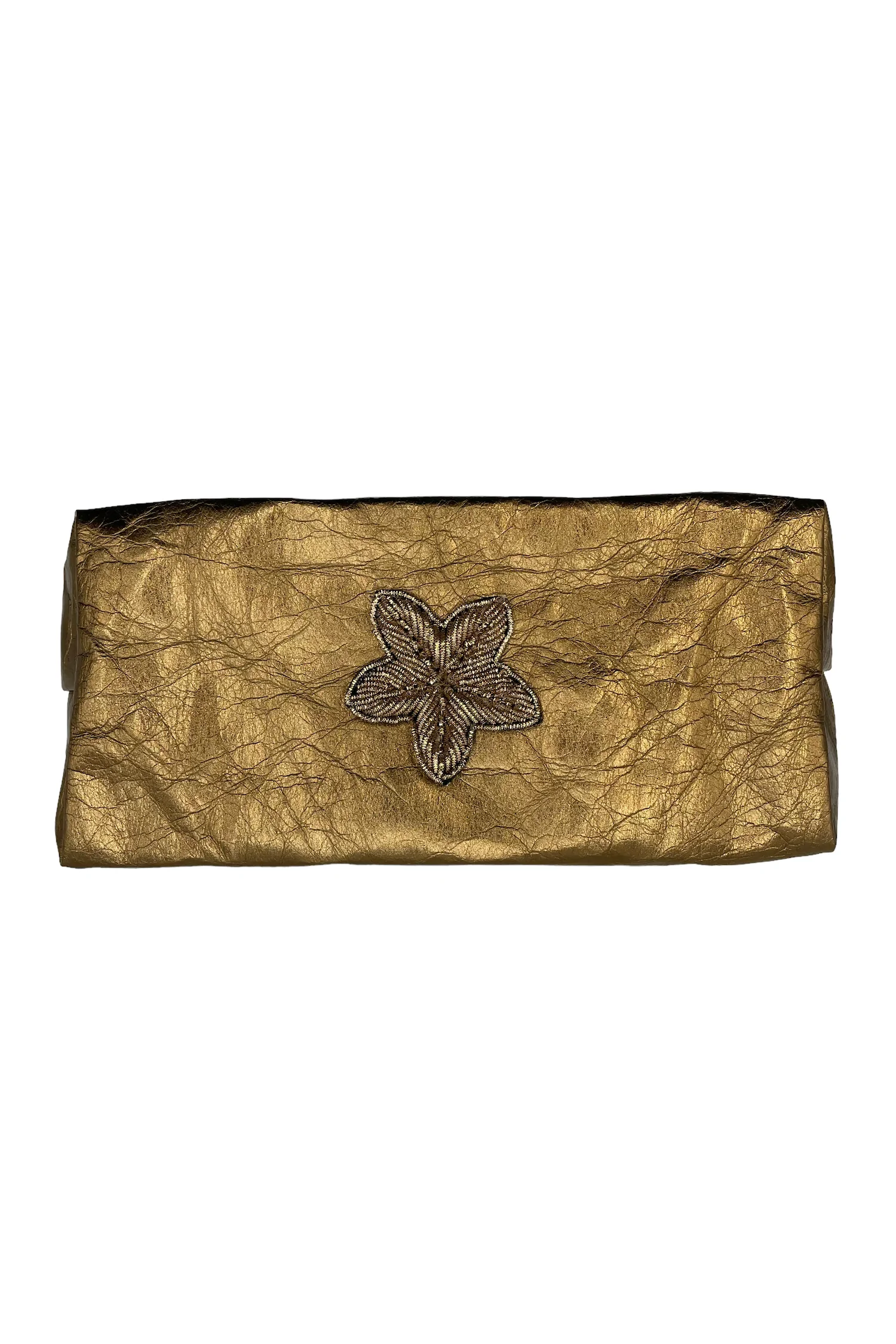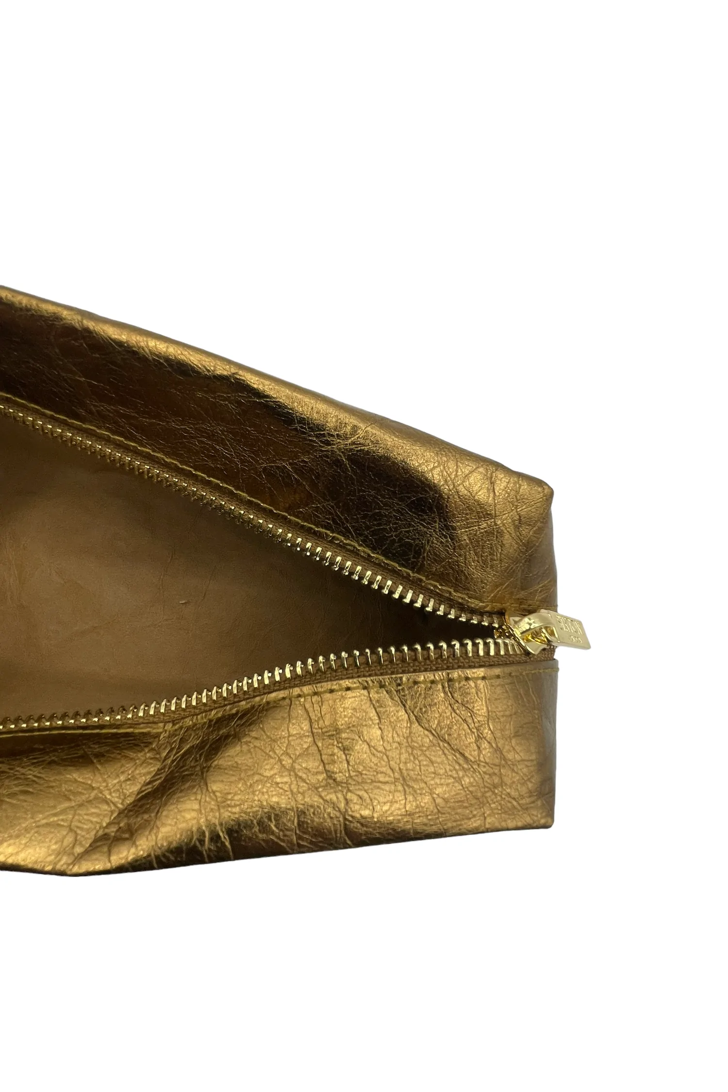 A luxurious, make up bag in bronze with a metallic eye motif - please note, the pin is stitched on.
