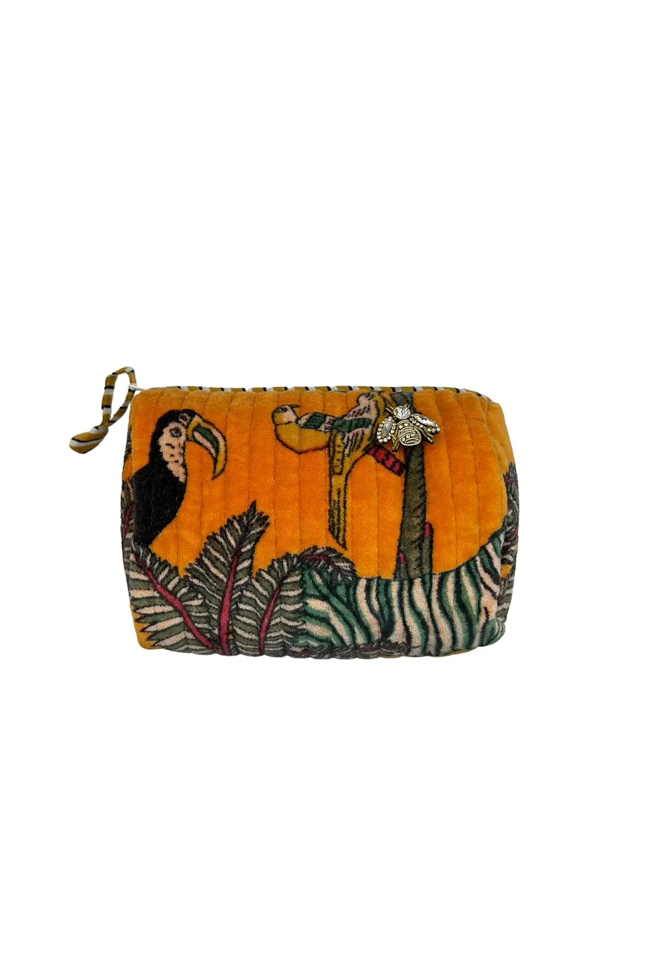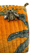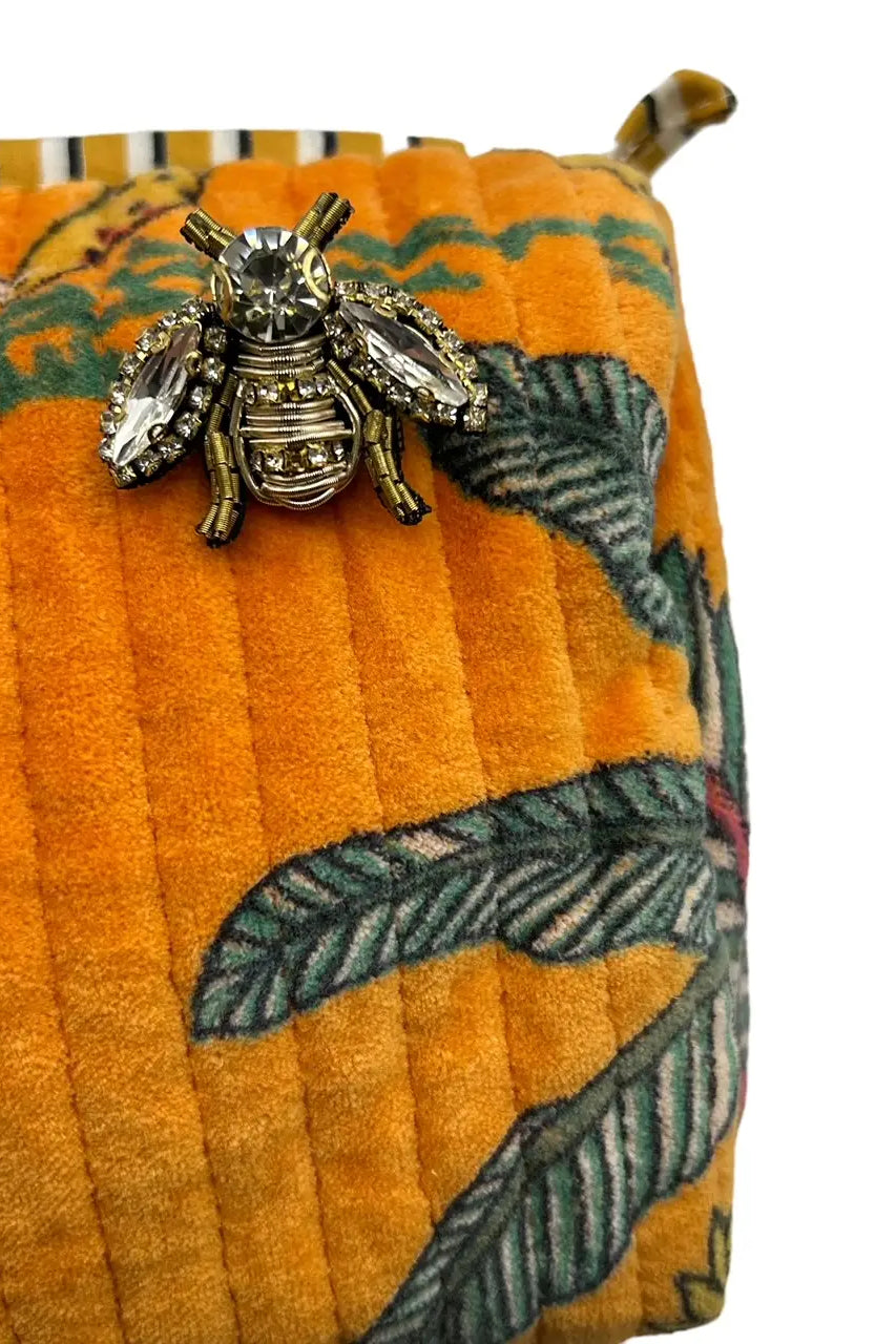 This stunning, quilted velvet make-up bag features a tropical print. Please note, the print position may differ on each bag. This make up bag comes with a detachable beaded insect brooch. Made in India.