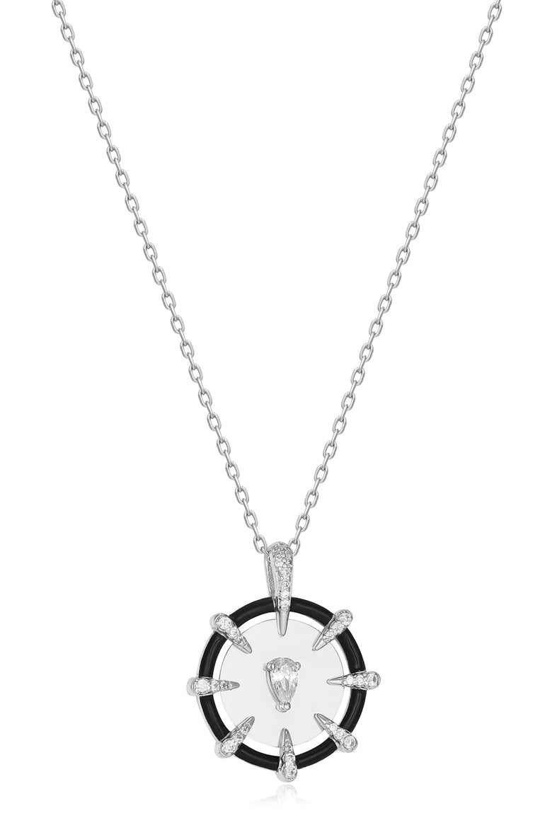 Make a statement with this bold yet elegant pendant necklace, finished with sleek, punk-inspired detailing. Set on a rhodium-plated sterling silver chain, the chic silver disc pendant is finished with a single sparkling cubic zirconia stone and encircled with sparkling point details and cool black edging.