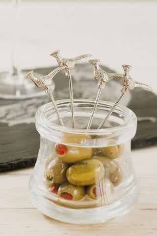 A set of 4 dainty olive picks perfect for serving your favourite olives. Each pick is topped with a cute animal design to add a little extra style. Gift boxed making them the perfect gift for any antipasti fanatic.