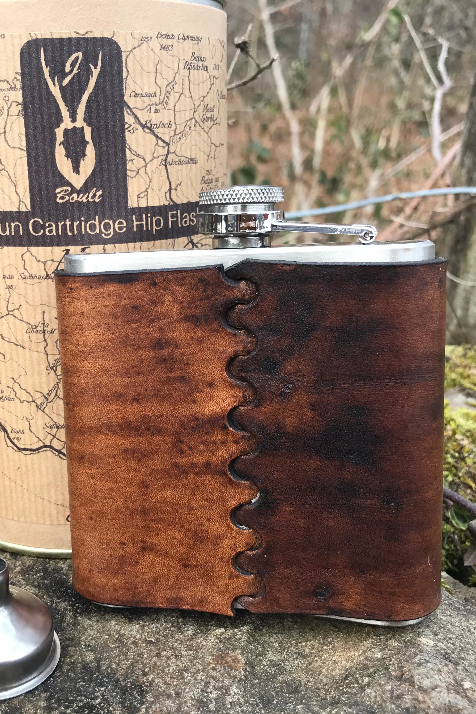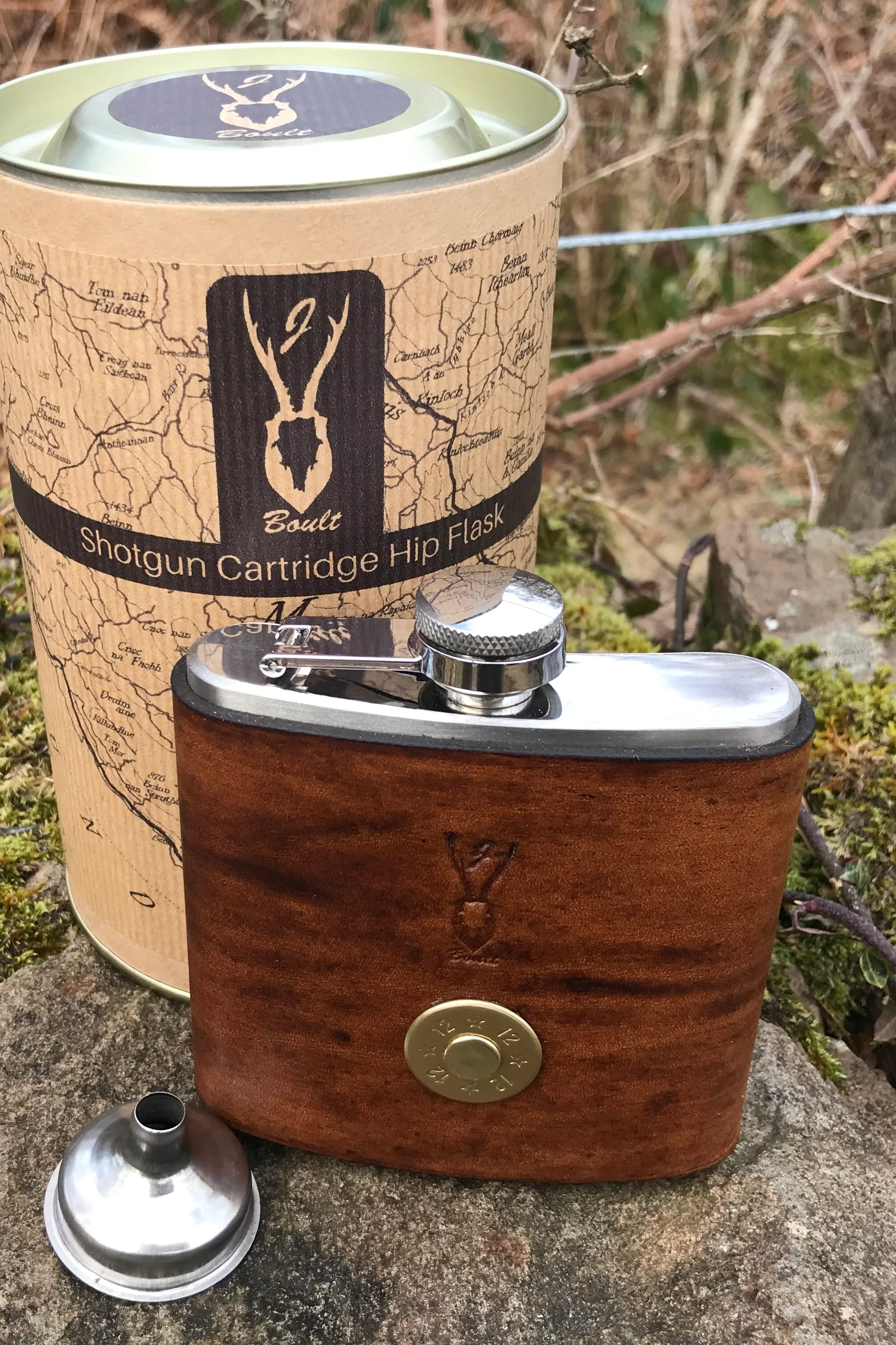 This Shotgun cartridge hip flask with handmade leather cover has been made with care in the J Boult Designs workshop. Each full leather-bound 6oz (177ml) stainless steel hip flask is made with an up-cycled 12 bore shotgun cartridge riveted into the leather. It is a must-have for any whisky or sloe gin lover for the bitter days on the peg or up the windswept hill. The hip flask gift set is perfect for gifting this autumn or festive season as it is an ideal companion on any Highland adventure.