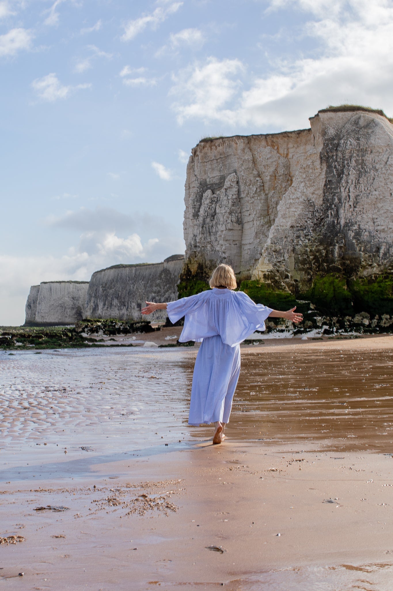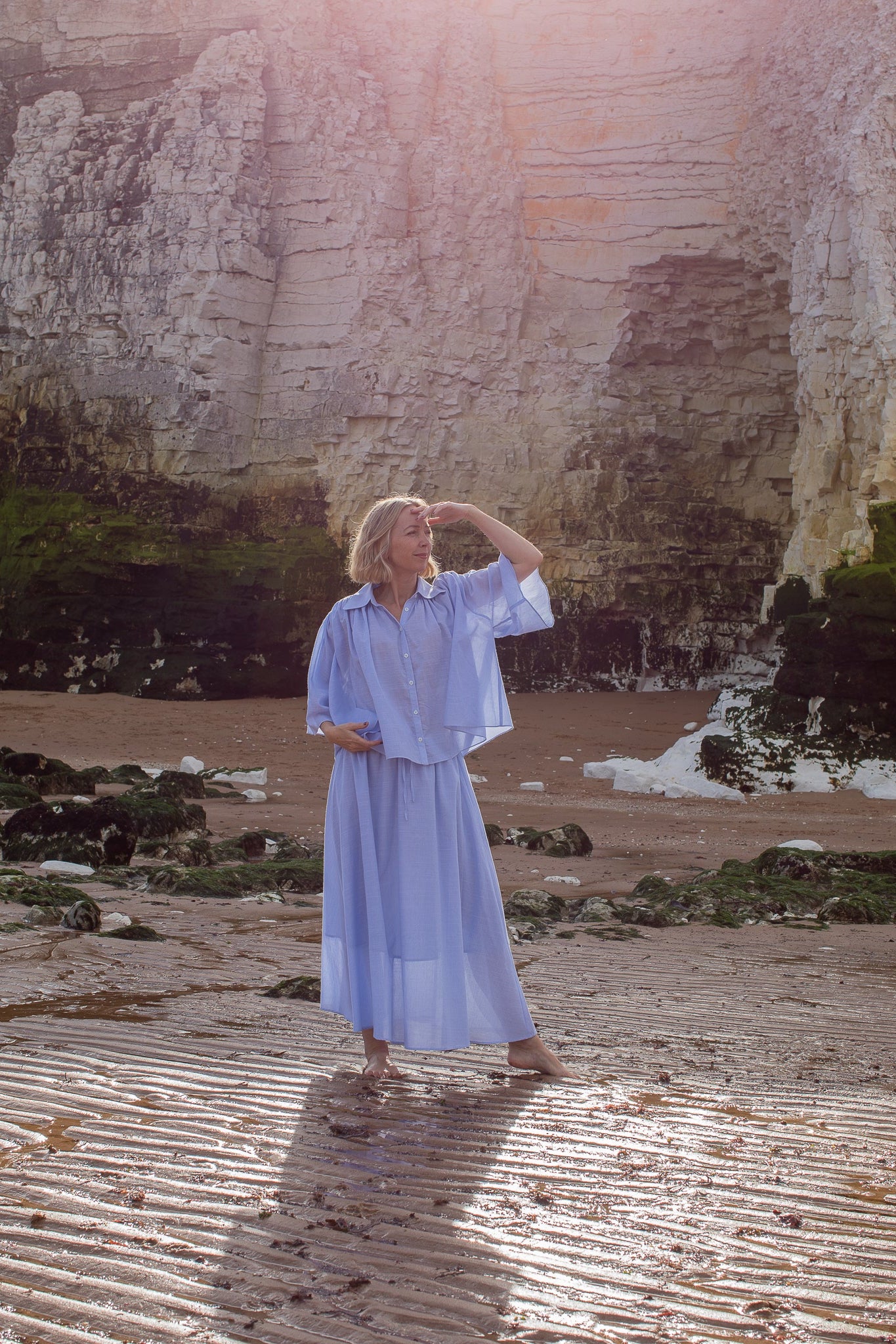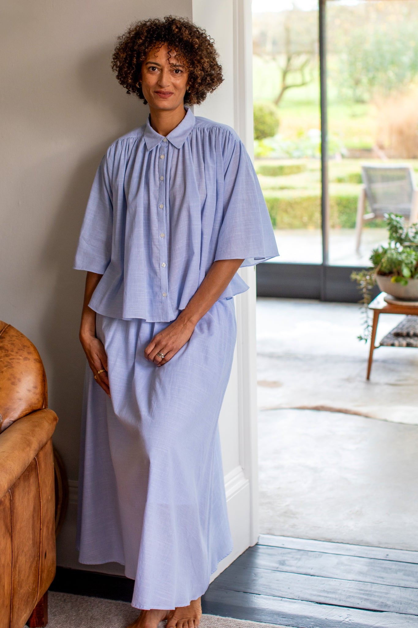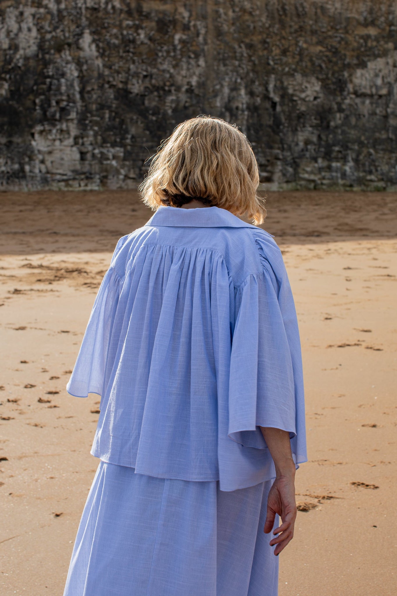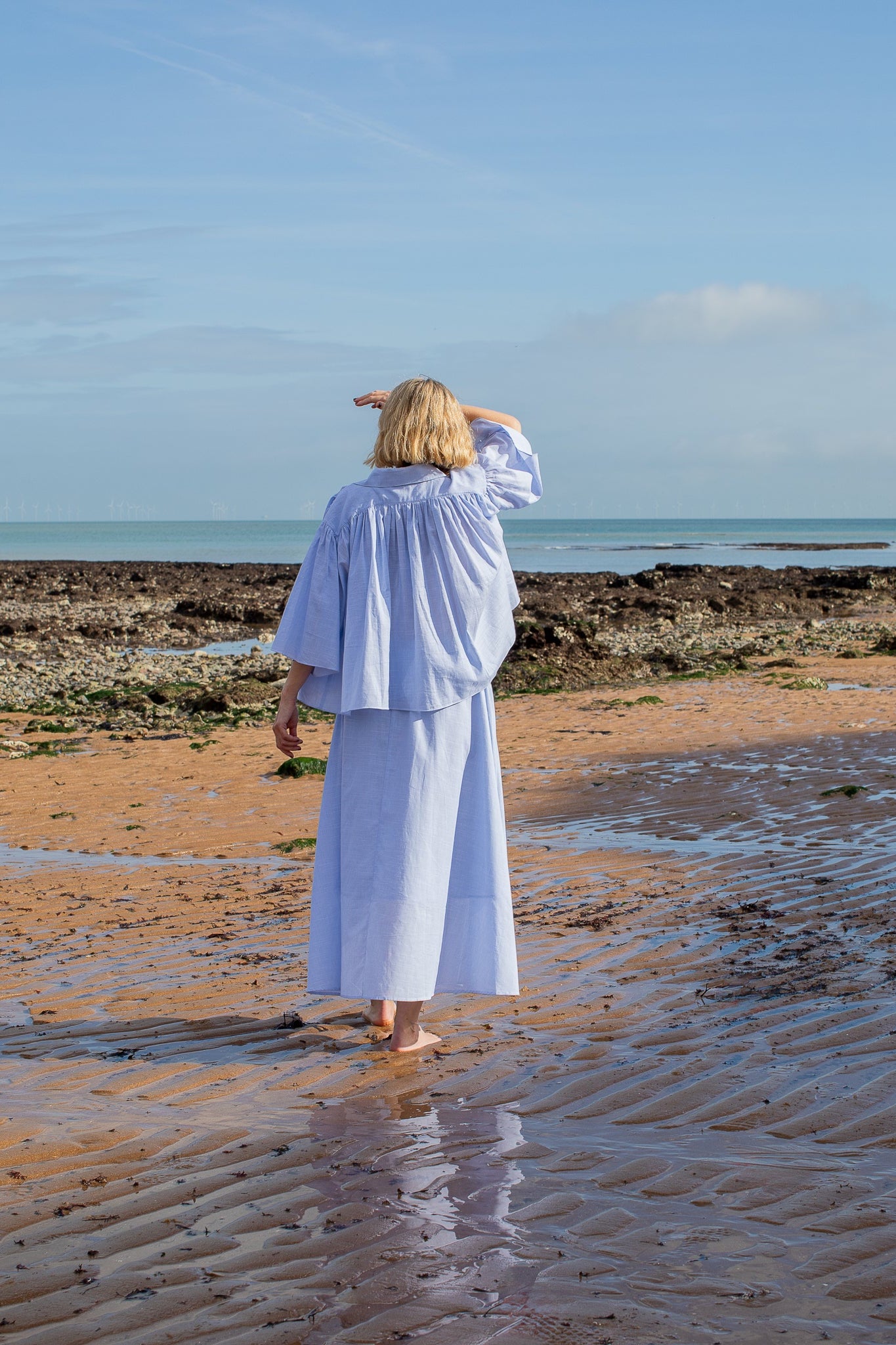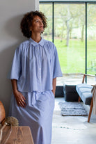 Stacey is a voluminous boxy three quarter length sleeve shirt. Designed with a full gathered back yoke, drop shoulder and button down front. Stacey shirt in a subtle blue stripe cotton is a spring staple.