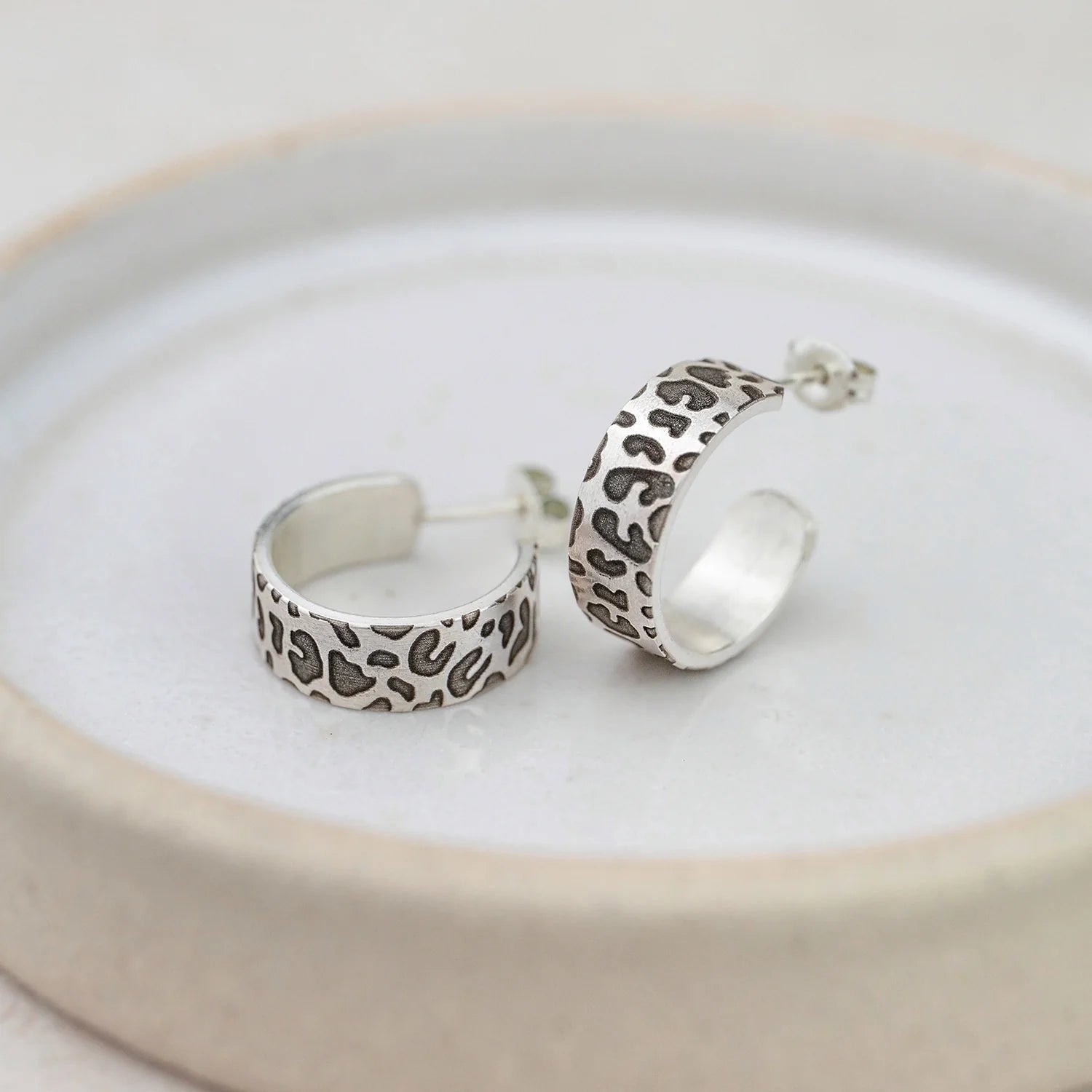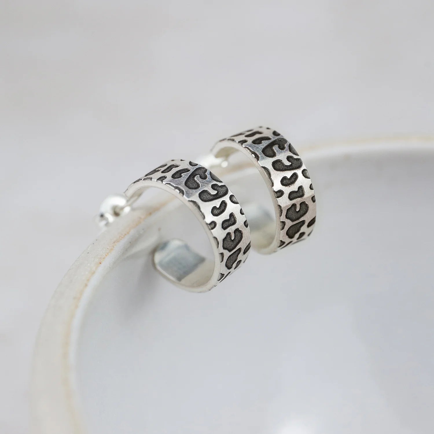 These comfy everyday style hoops are approximately 6mm wide with a leopard print finish. The diameter of these hoops are 15mm across and the sterling silver wire is approximately 1mm thick.