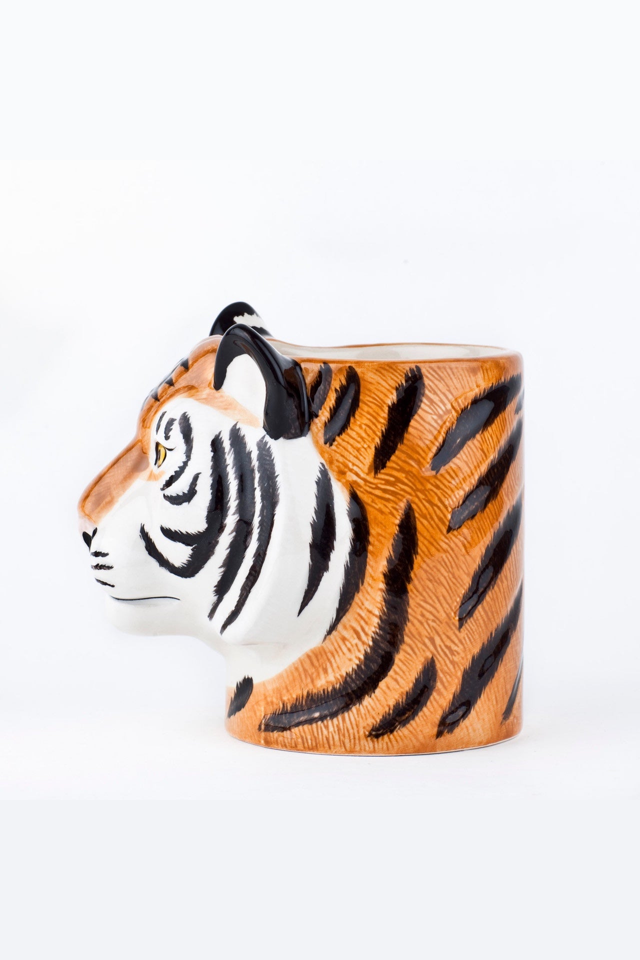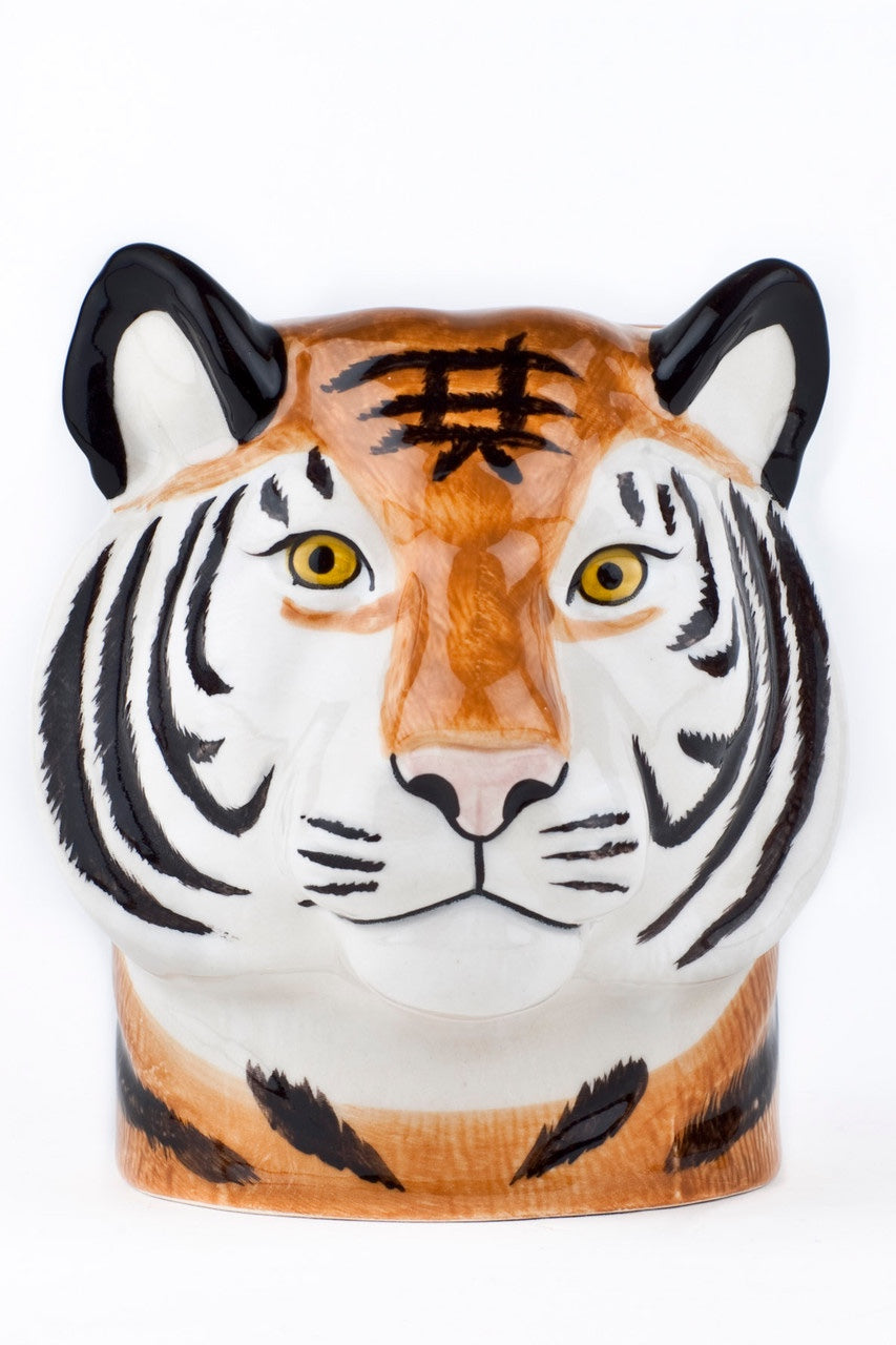 Add a touch of the exotic to your desk with this hand-painted Tiger Pencil Pot from Quail Ceramics. With its lifelike detail and unique design, this charming pot will keep your writing utensils organised while adding a touch of sophistication to your workspace. Measuring approximately 12cms h x 8 cms w x 10.5cms d, it is the perfect size to hold all of your essential writing tools. Elevate your desk and unleash your inner wild cat with this luxurious and exclusive pencil pot.