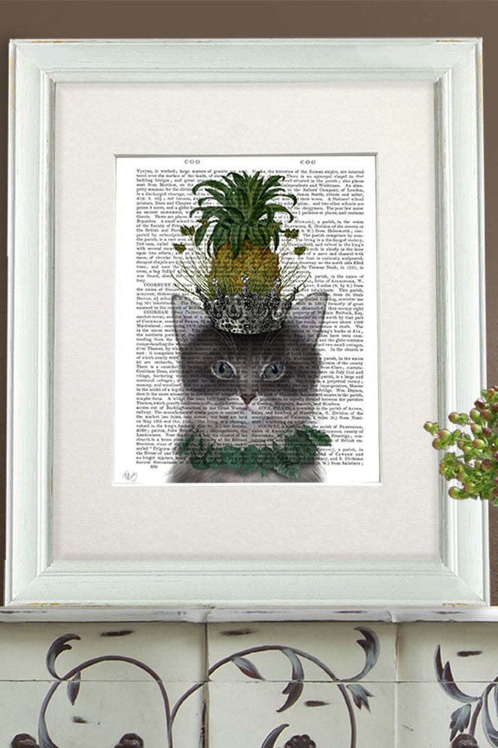 Original hand printed artwork featuring a cute little kitten wearing a fancy tropical pineapple crown. Original hand printed artwork featuring the imaginative illustrations of UK artist Kelly Stevens-Mclaughlan. There's a whole cabinet of curiosities for you to choose from.